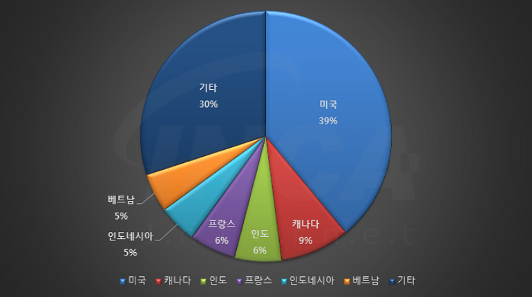 2023년 5월(5월 1일 ~ 5월 31일)에 발생한 데이터 유출 건을 국가별로 비교하였을 때 미국이 39%로 가장 높은 비중을 차지했고, 캐나다가 9%, 인도와 프랑스가 6%로 그 뒤를 따랐다.