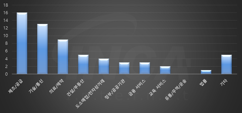 2023년 5월(5월 1일 ~ 5월 31일)에 발생한 데이터 유출 건을 산업별로 비교하였을 때 제조/공급 분야가 가장 많은 공격을 받았고, 기술/통신 분야가 그 뒤를 따랐다.