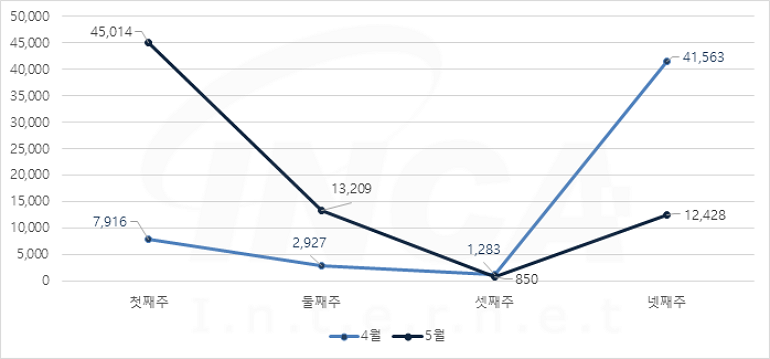 5월 한달 동안 악성코드 진단 현황을 주 단위로 살펴보았을 때 셋째 주를 기점으로 감소에서 증가로 바뀌는 추이를 보였다.