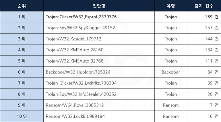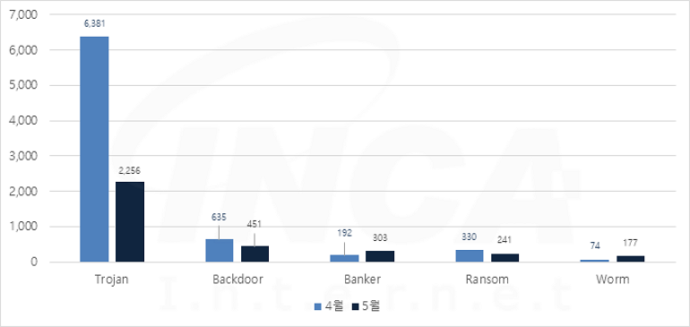 5월에는 악성코드 유형별로 4월과 비교하였을 때 Banker와 Worm의 진단 수가 증가했고, Trojan, Backdoor 및 Ransom의 진단 수가 감소했다.