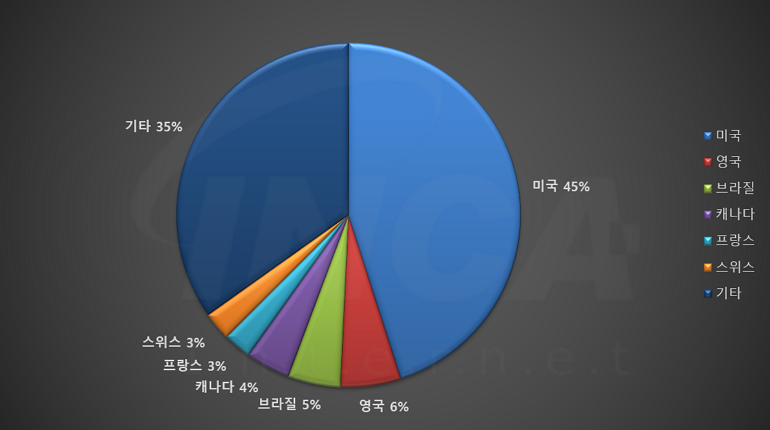 2023년 6월(6월 1일 ~ 6월 30일)에 발생한 데이터 유출 건을 국가별로 비교하였을 때 미국이 45%로 가장 높은 비중을 차지했고, 영국과 브라질이 각각 6%와 5%로 그 뒤를 따랐다.