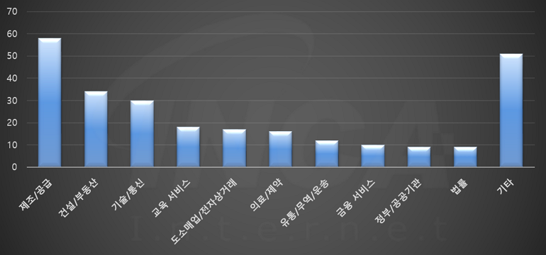 2023년 6월(6월 1일 ~ 6월 30일)에 발생한 데이터 유출 건을 산업별로 비교하였을 때 제조/공급 분야가 가장 많은 공격을 받았고, 건설/부동산 분야가 그 뒤를 따랐다.