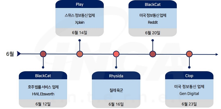 2023년 6월(6월 1일 ~ 6월 30일) 한 달간 랜섬웨어 동향을 조사한 결과, 호주 법률 서비스 제공 업체 HWL Ebsworth와 미국 정보통신 업체 Reddit이 "BlackCat" 랜섬웨어 공격을 받아 데이터가 유출된 정황이 발견됐다. 또한, 스위스 정보통신 업체 Xplain과 칠레 육군이 각각 "Play"와 "Rhysida" 랜섬웨어 공격을 받아 운영에 차질을 빚었다. 한편, 미국 정보통신 업체 Gen Digital은 "Clop" 랜섬웨어의 공격을 받았으며 외신은 취약점이 공개된 MOVEit 프로그램 사용을 침해 사고의 원인으로 추정하고 있다.