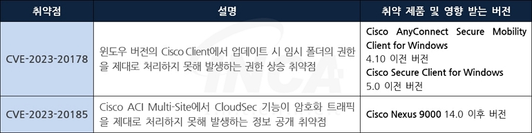 Cisco 사는 제품에서 발생하는 취약점에 대한 보안 업데이트를 발표하고, 관련 취약점을 해결하기 위해 최신 버전으로 업데이트할 것을 권고하였다.