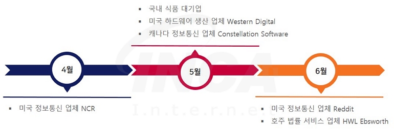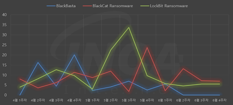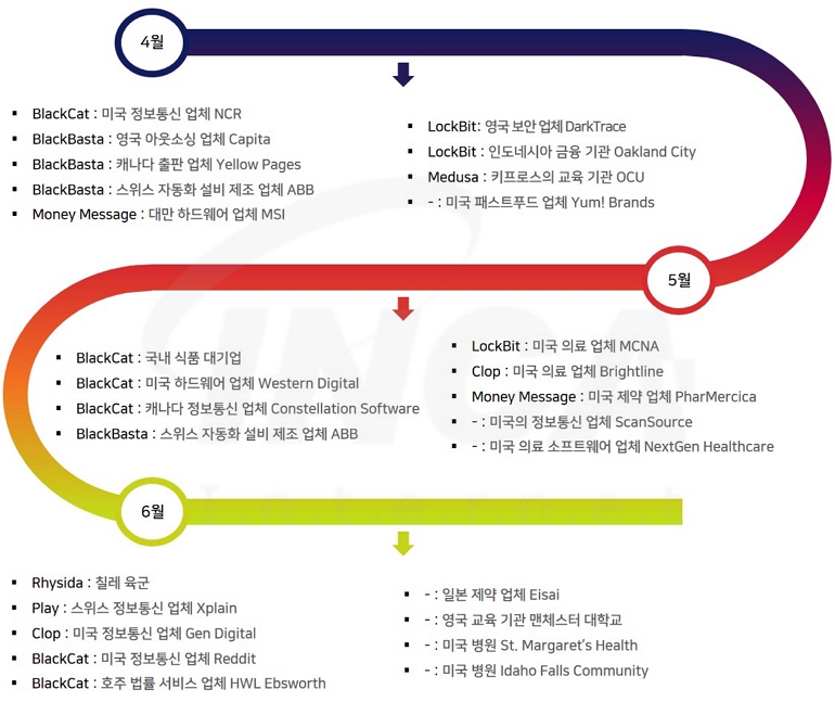2023년 2분기(4월 1일 ~ 6월 30일) 동안 랜섬웨어 동향을 조사한 결과, 국내/외에서 블랙바스타(BlackBasta)와 블랙캣(BlackCat) 등의 랜섬웨어로 인한 피해가 다수 발견됐다. 4월에는 캐나다 출판 업체가 블랙바스타 랜섬웨어 공격을 받았고, 5월과 6월에는 국내 식품 대기업과 스위스 정보통신 업체가 각각 블랙캣과 플레이(Paly) 랜섬웨어 공격을 받아 피해가 발생했다.