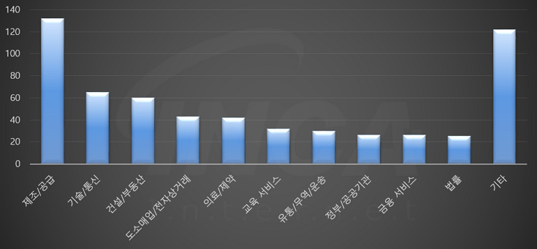 2023년 2분기(4월 1일 ~ 6월 30일)에 발생한 데이터 유출 건을 산업별로 비교했을 때 제조/공급 분야가 가장 많은 공격을 받았고, 기술/통신 분야가 그 다음으로 많은 공격을 받았다. 또한, 건설/부동산 분야가 그 뒤를 따랐다.