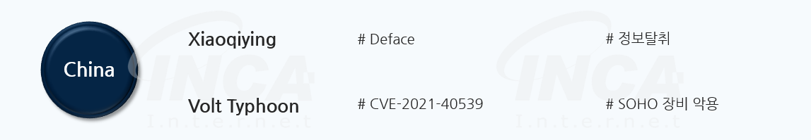 Xiaoqiying 해커 그룹은 1분기에 이어 한국의 기업을 대상으로 공격을 수행하였으며, Volt Typhoon 해커 그룹은 미국의 사회 기반 시설을 공격한 것으로 알려졌다.
