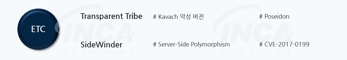 위에 언급한 해커 그룹 외에도 여러 해커 그룹들이 탐지를 회피하고 악성 코드를 유포하기 위해 정상 도구의 악성버전을 제작하거나 서버 측 다형성 기법을 사용한 공격이 발견되었다.