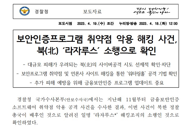 2분기에 발견된 북한 해커 그룹의 워터링 홀 공격은 금융보안인증 프로그램이 피해자 PC에 설치되어 있을 때, 특정 언론사 사이트에 접근하면 악성코드를 설치하도록 설계되었다. 경찰청 국가수사본부에 따르면, 국내 언론사 8곳을 포함하여 61개 기관이 감염되었다고 전해진다.