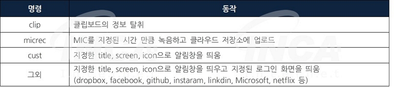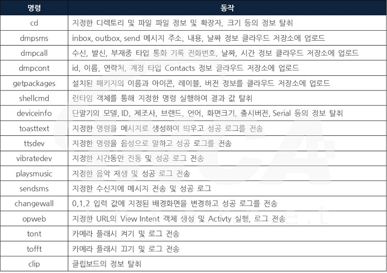 각종 권한을 획득했다면, 원격지를 통해 원격제어 동작을 수행한다. 공격자가 원격지로 생성한 Firebase DB에서 공격자가 지정한 경로에 대한 참조의 이벤트 리스너를 통해 데이터 변경 이벤트가 발생하면, 이벤트에 명령을 확인하여 다음의 동작을 수행한다.