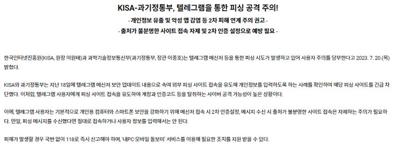 한국인터넷진흥원과 과학기술정보통신부(과기정통부)는 텔레그램 메신저에서 보안 업데이트 안내로 위장한 메시지에 피싱 사이트 링크가 포함된 정황에 대해 공지했다.