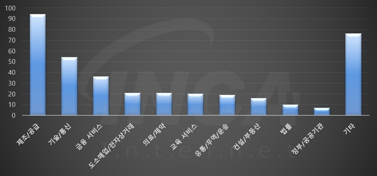 2023년 7월(7월 1일 ~ 7월 31일)에 발생한 데이터 유출 건을 산업별로 비교하였을 때 제조/공급 분야가 가장 많은 공격을 받았고, 건설/부동산 분야가 그 뒤를 따랐다.