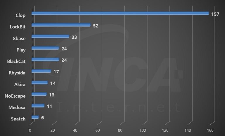 2023년 7월(7월 1일 ~ 7월 31일)에 발생한 데이터 유출 현황을 랜섬웨어 진단명 별로 비교하였을 때 “Clop” 랜섬웨어가 157건으로 가장 많은 데이터 유출이 있었고, “LockBit” 랜섬웨어와 “8base” 랜섬웨어가 각각 52건과 33건의 유출 사례를 기록했다.