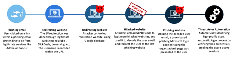 보안 업체 Proofpoint는 신뢰할 수 있는 업체로 위장한 공격자의 피싱 메일에서 캠페인이 시작된다고 전했다. 피싱 메일은 정상적인 웹사이트로 위장한 링크를 포함하고 있으며, 접속할 경우 공격자가 사전에 만든 사이트로 리다이렉션을 한다. 해당 링크로 접속한 사용자가 로그인을 시도하면, 공격자는 “EvilProxy”를 사용해 계정 정보와 MFA 인증 정보 등을 탈취한다. 이후, 탈취한 계정으로 로그인 한 공격자는 MFA 인증 방식을 추가해 지속적인 접근을 가능하게 하며 금융 사기 및 데이터 유출 등의 추가 공격을 수행할 수 있게 된다.