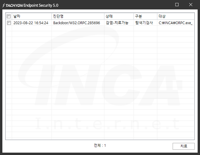 상기 악성코드는 잉카인터넷 안티바이러스 제품 TACHYON Internet Security 5.0에서 진단 및 치료가 가능하다.