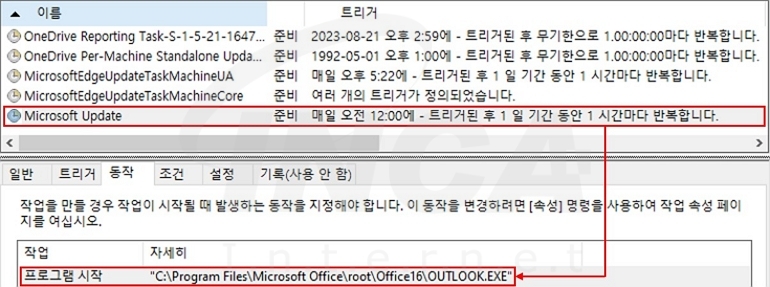 “ORPC” 백도어는 먼저 작업 스케줄러에 Outlook을 주기적으로 실행하는 새로운 작업을 추가해 지속성을 획득한다. 해당 작업은 [그림 1]과 같이 “Miscrosoft Update”라는 이름으로 등록돼 정상 작업처럼 위장한다.