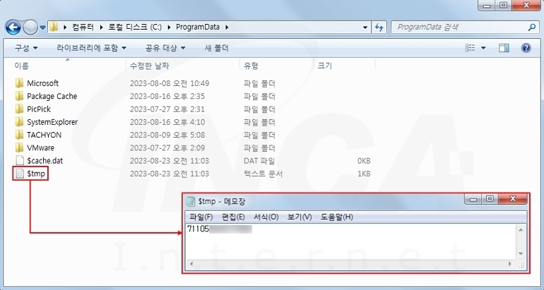 C&C 서버와 연결에 성공하면, 서버는 클라이언트 ID를 할당해 감염된 PC를 구분하며, ID는 [그림 4]와 같이 감염된 PC에 저장된다.