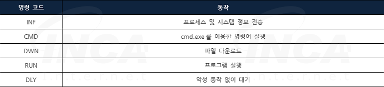 추가로, 서버는 감염된 PC에 명령 코드를 전송해 악성 동작을 수행한다. [표 1]은 명령 코드와 그에 따른 동작을 나타낸다.