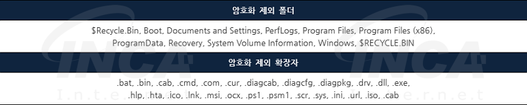 암호화는 랜섬웨어 실행 시 대상 폴더를 지정할 수 있으며, 대상 폴더를 생략하면 시스템 전체를 대상으로 암호화를 진행한다. 단, [표 1]의 암호화 제외 폴더와 암호화 제외 확장자를 지닌 파일은 암호화하지 않는다.