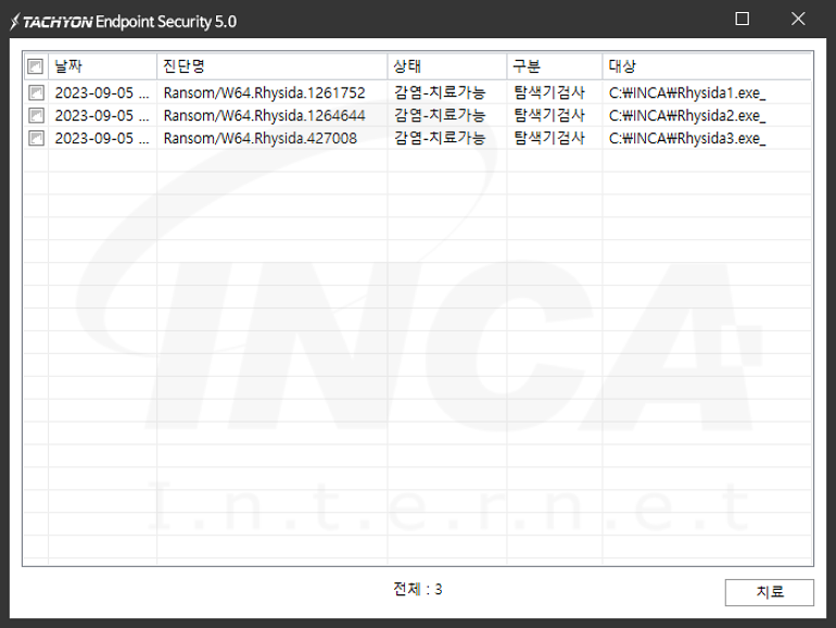 상기 악성코드는 잉카인터넷 안티바이러스 제품 TACHYON Internet Security 5.0에서 진단 및 치료가 가능하다.