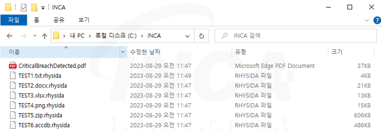 “Rhysida” 랜섬웨어는 사용자 PC의 파일을 암호화하고, “CriticalBreachDetected.pdf”란 이름의 랜섬노트를 생성한다.
