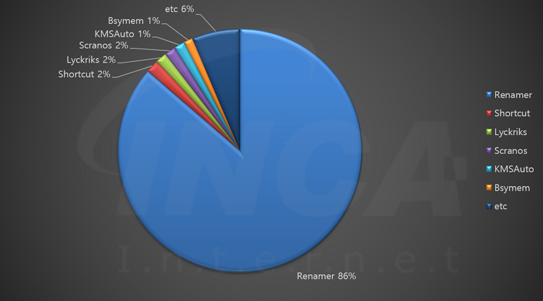 2023년 8월(8월 1일 ~ 8월 31일) 한 달간 잉카인터넷 대응팀은 사용자에게 가장 많이 피해를 준 악성코드 현황을 조사하였으며, 진단명 별로 비교하였을 때 “Renamer”가 86%로 가장 높은 비중을 차지했다.