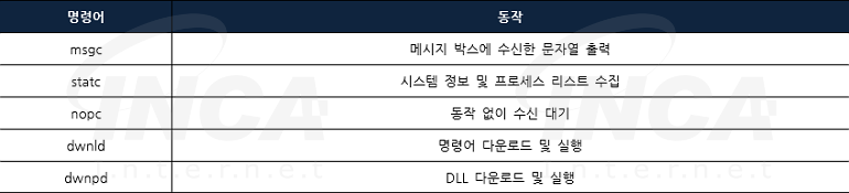 C&C서버와 연결에 성공하면 서버로부터 명령어를 수신해 [표 1]의 추가 동작을 수행한다. 단, 분석 시점에서 서버가 응답하지않아 추가 명령 및 DLL의 동작을 확인할 수 없다.