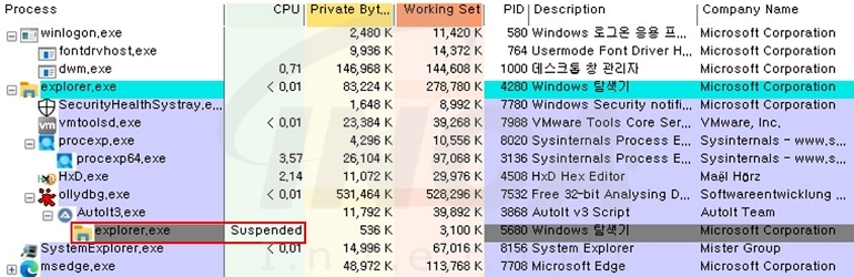 이후, 프로세스 할로잉 대상이 될 “explorer.exe” 프로세스의 인스턴스를 suspended 상태로 생성한다.