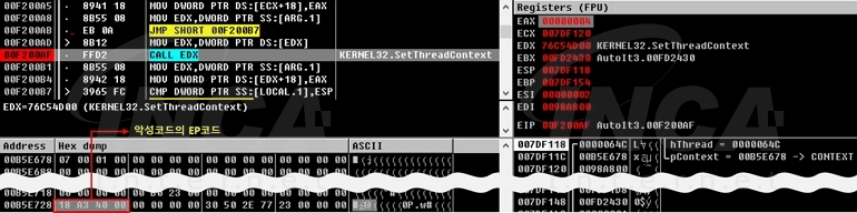 생성된 “explorer.exe” 인스턴스의 스레드 컨텍스트에서 EIP값을 “SuperBear”의 EP코드로 수정해 해당 프로세스가 재개될 때 악성코드가 실행되도록 한다.