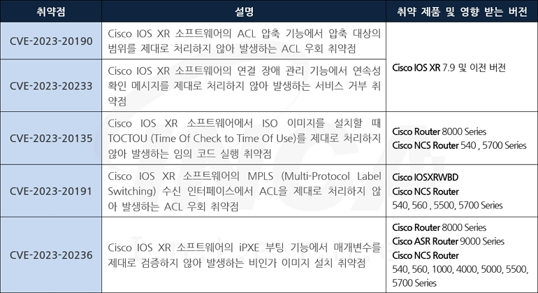Cisco 사는 자사 제품에서 발생하는 취약점에 대한 보안 업데이트를 발표하고, 관련 취약점을 해결하기 위해 최신 버전으로 업데이트할 것을 권고하였다.
