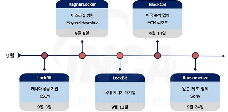 2023년 9월(9월 1일 ~ 9월 30일) 한 달간 랜섬웨어 동향을 조사한 결과, 캐나다의 공공 기관 CSEM과 국내 에너지 대기업이 "LockBit" 랜섬웨어 공격을 받아 데이터가 유출됐다. 또한, 이스라엘의 병원 Mayanei Hayeshua와 일본의 제조 업체 Sony는 각각 "RagnarLocker"와 "Ransomedvc" 랜섬웨어 공격을 받아 데이터가 유출된 사례가 있었다. 한편, 미국의 숙박 업체 MGM 리조트는 "BlackCat" 랜섬웨어의 공격으로 서비스 운영에 차질을 빚었다.