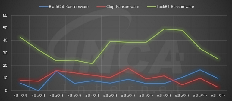 2023년 3분기(7월 1일 ~ 9월 30일) 동안 랜섬웨어 동향을 조사한 결과, 국내/외에서 블랙캣(BlackCat)과 클롭(Clop) 등의 랜섬웨어로 인한 피해가 다수 발견됐다. 7월에는 미국과 영국의 컨설팅 업체가 클롭 랜섬웨어 공격을 받았고, 8월과 9월에는 일본의 제조 업체와 국내 에너지 대기업이 각각 블랙캣과 락빗(LockBit) 랜섬웨어 공격을 받아 피해가 발생했다.