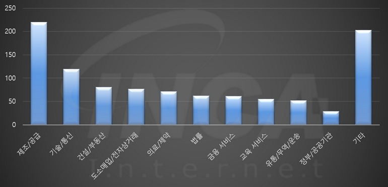 2023년 3분기(7월 1일 ~ 9월 30일)에 발생한 데이터 유출 건을 산업별로 비교했을 때 제조/공급 분야가 가장 많은 공격을 받았고, 기술/통신 분야가 그 다음으로 많은 공격을 받았다. 또한, 건설/부동산 분야가 그 뒤를 따랐다.