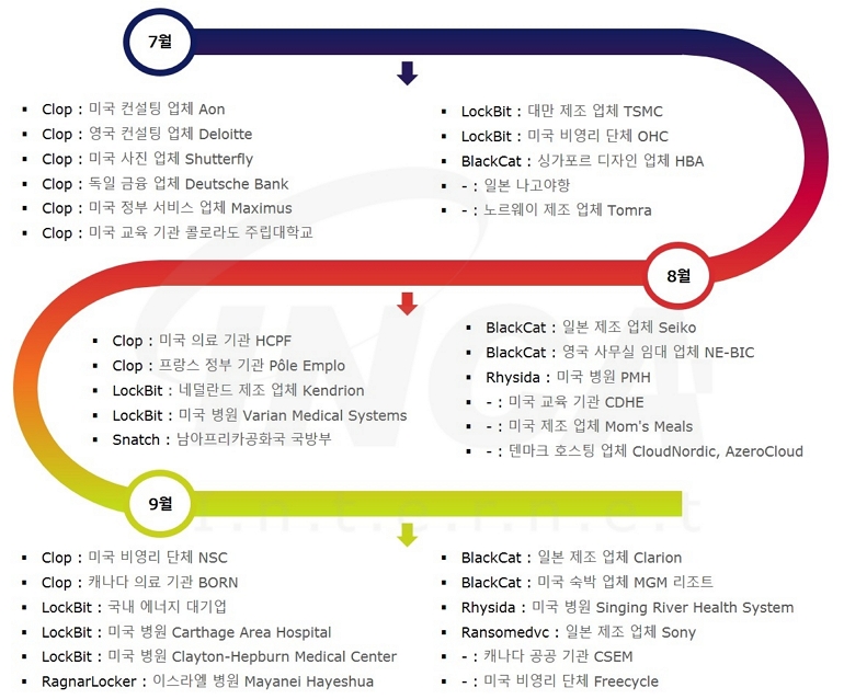 2023년 3분기(7월 1일 ~ 9월 30일) 동안 랜섬웨어 동향을 조사한 결과, 국내/외에서 블랙캣(BlackCat)과 클롭(Clop) 등의 랜섬웨어로 인한 피해가 다수 발견됐다. 7월에는 미국과 영국의 컨설팅 업체가 클롭 랜섬웨어 공격을 받았고, 8월과 9월에는 일본의 제조 업체와 국내 에너지 대기업이 각각 블랙캣과 락빗(LockBit) 랜섬웨어 공격을 받아 피해가 발생했다.