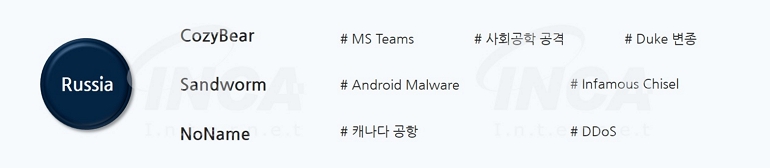 2023년 3분기 러시아의 해커그룹 CozyBear와 Sandworm 그룹의 공격이 발견되었다. CozyBear 해커그룹은 MS Teams를 통한 사회공학 공격과 NATO 가입국을 대상으로 하는 피싱 공격을 수행하였고, Sandworm 해커그룹은 모바일 악성코드를 유포하는 캠페인을 수행하였다. 또한, 친러 성향의 NoName 해커그룹이 캐나다 공항을 대상으로 DDoS 공격을 수행하였다.