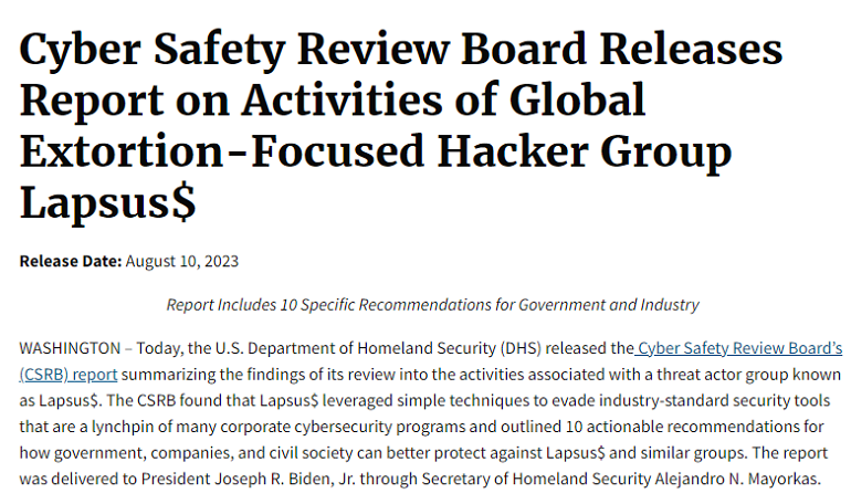 최근 미국 국토안보부 (DHS) 에서 Lapsus$ 해커 그룹 공격에 대한 현황 보고서를 공개하였다.