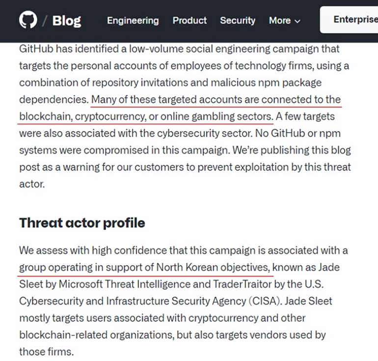 Github는 암호화폐 및 블록체인 기업을 대상으로 하는 공격에 대해 북한의 소행으로 보고 이에 대한 보안 권고문을 게시하였다. 해당 권고문에 따르면, 관련 업종의 개발자에게 사회 공학 공격을 시도하는 것으로 전해진다. 이에 대해 지난 4월 미국 CISA에서도 보안 권고문을 게시하기도 하였다.