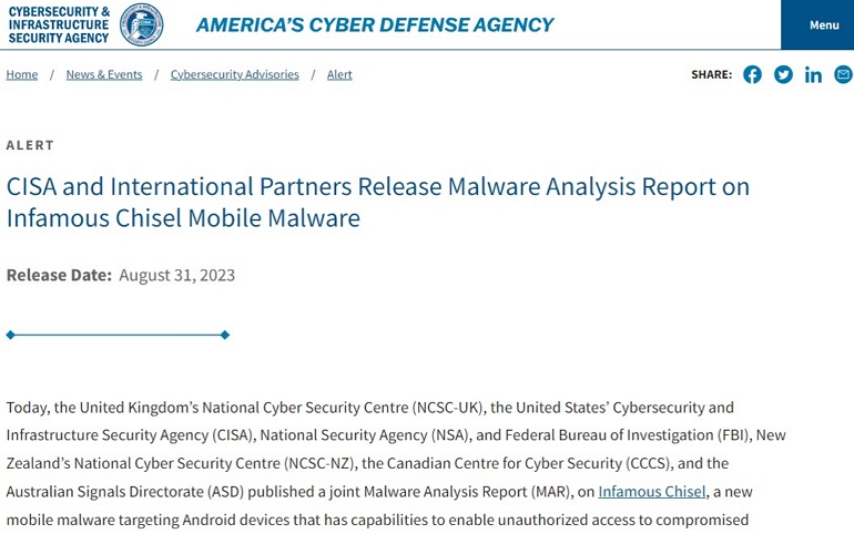 이번 3분기에 발견된 공격은 Android 단말기를 대상으로 하며, ‘Infamous Chisel’ 이라고 불리는 모바일 악성코드를 사용하였다. CISA에 따르면, 해당 악성코드는 Tor 네트워크를 통해 유포되었으며, 피해자의 정보를 주기적으로 수집하고 탈취하는 동작을 수행하는 것으로 전해진다. 탈취하는 정보는 시스템 정보 및 애플리케이션 정보 등이 있는 것으로 밝혀졌다.