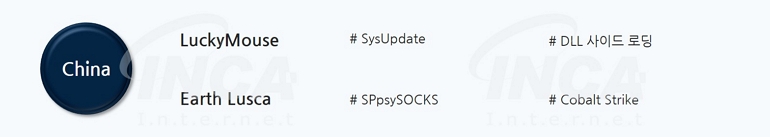 LuckyMouse 해커 그룹은 정상 실행 파일이 DLL 파일을 로드하는 과정을 악용하는 DLL 사이드 로딩 기법을 사용해 SysUpdate 악성코드를 유포하였으며, Earth Lusca 해커 그룹은 제로데이 취약점을 이용해 공격 대상의 네트워크에 침투하여 SprySOCKS 악성코드를 유포하였다.