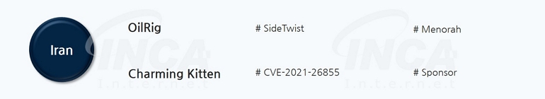 OilRig 해커 그룹은 악성 문서를 통해 SideTwist 의 변종 버전들을 유포하였으며, Charming Kitten 해커 그룹은 Microsoft Exchange 서버의 취약점을 이용해 침투한 뒤, Sponsor 악성코드를 유포하였다.