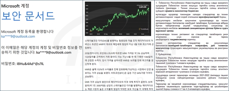 “SugarGh0st RAT” 악성코드는 [그림 1]과 같이 한국어 또는 우즈베크어로 작성된 미끼 문서를 띄워 정상 파일인 것처럼 사용자를 속이고, 백그라운드에서 악성 동작을 수행한다.