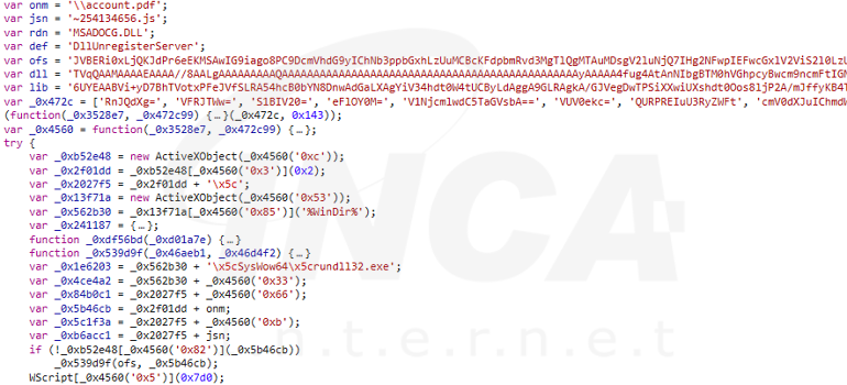 자바 스크립트는 [그림 3]과 같이 난독화가 적용돼 있으며, 인코딩된 미끼 문서, DLL 파일 및 “SugarGh0st” 페이로드를 포함하고 있다.