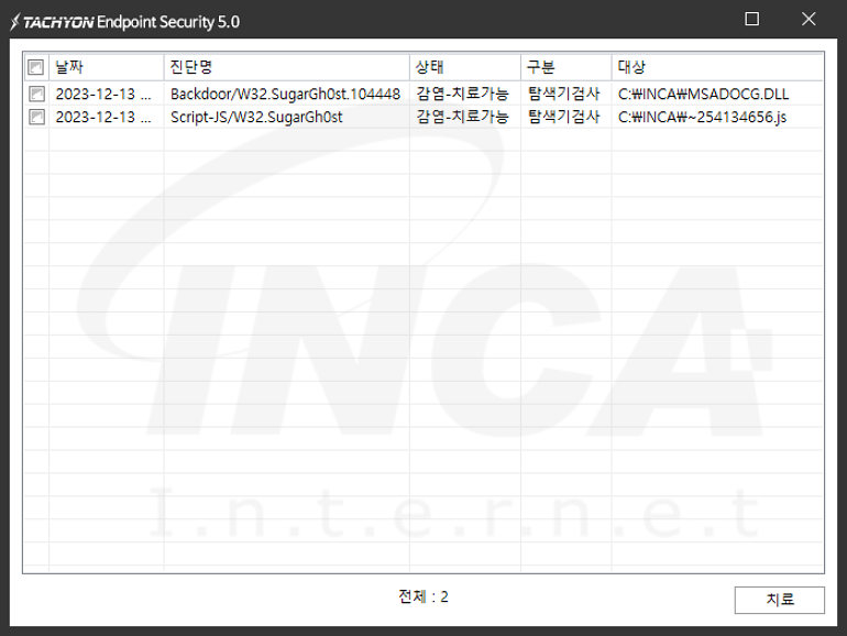 상기 악성코드는 잉카인터넷 안티바이러스 제품 TACHYON Internet Security 5.0에서 진단 및 치료가 가능하다.