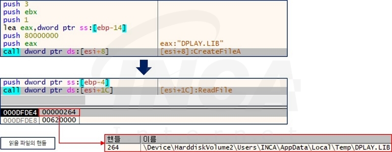 호출된 함수는 함께 드롭된 “DPALY.LIB” 파일을 읽어 메모리에 로드한다.