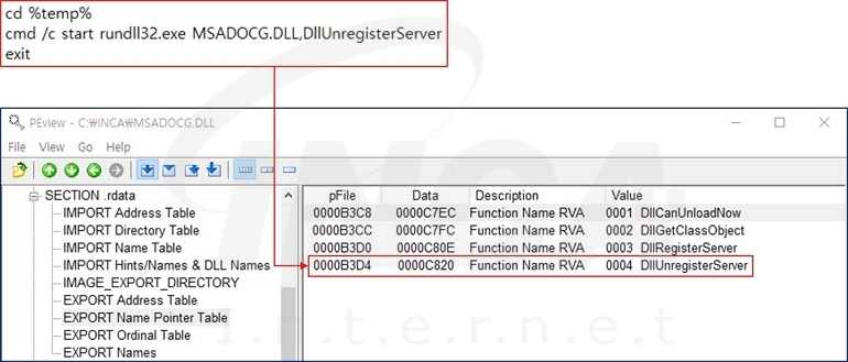 “ctfmon.bat” 파일을 실행하면, “rundll32.exe”를 사용해 “MSADOCG.DLL”의 “DllUnregisterServer” 함수를 호출한다.