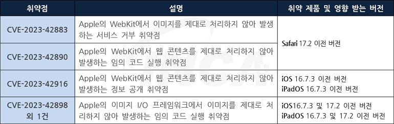 Apple 사는 자사 제품에서 발생하는 취약점에 대한 보안 업데이트를 발표하고, 관련 취약점을 해결하기 위해 최신 버전으로 업데이트할 것을 권고하였다.