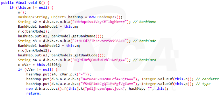 사용자가 입력한 개인 및 금융 정보는 수집 후 공격자의 서버로 전송되며, [그림 3]은 정보 수집의 예로 은행 및 카드 정보가 해시맵 형태로 저장되는 것을 확인할 수 있다.